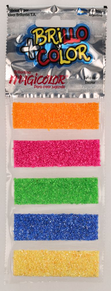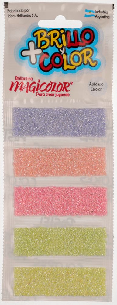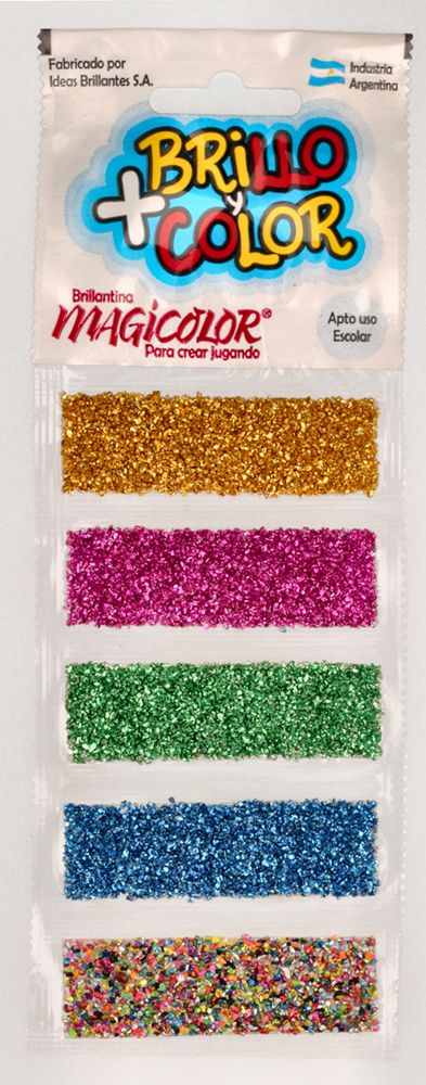 Brillantinas MAGICOLOR es un producto creado para darle brillo, color y textura a todo tipo de manualidades. Puede utilizarse sobre múltiples superficies. Formulada con materias primas naturales (carbonato de calcio y magnesio de óptima calidad), es no tóxica. Su utilización en manualidades escolares ayuda a desarrollar destrezas y habilidades, tanto motrices como sensoriales.